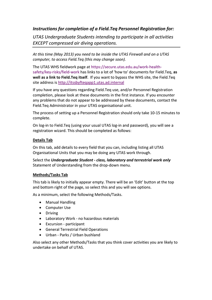 Instructions For Completion Of A Field Teq Personnel Registration